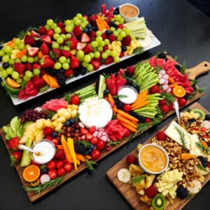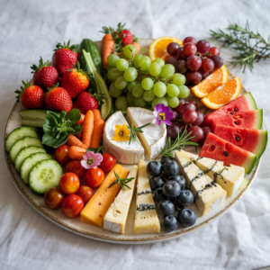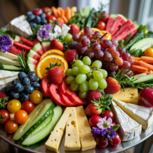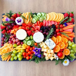 שילוב צבעוני ומרענן של פירות עונתיים וירקות חתוכים, מוגשים בצורה אסתטית ואלגנטית. אידיאלי לאירוח, מסיבות, פיקניקים או כפינוק לשבת בבוקר.
